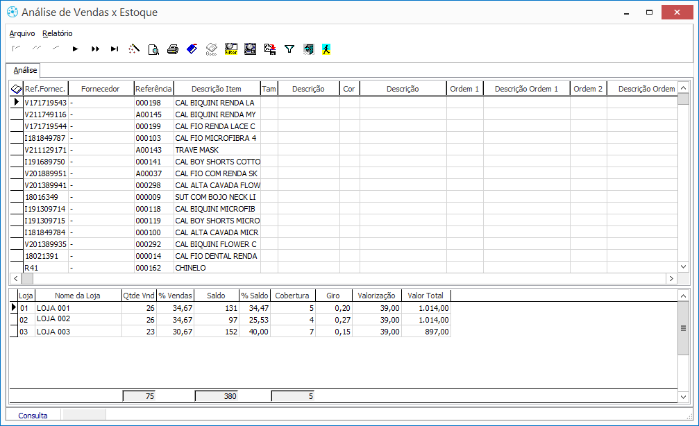 Selecione o nível de detalhe desejado (referência, referência+tamanho, referência+cor, referência+tamanho+cor, referência+cor+tamanho), o período, a ordem desejada do relatório (por referência ou decrescente de vendas).