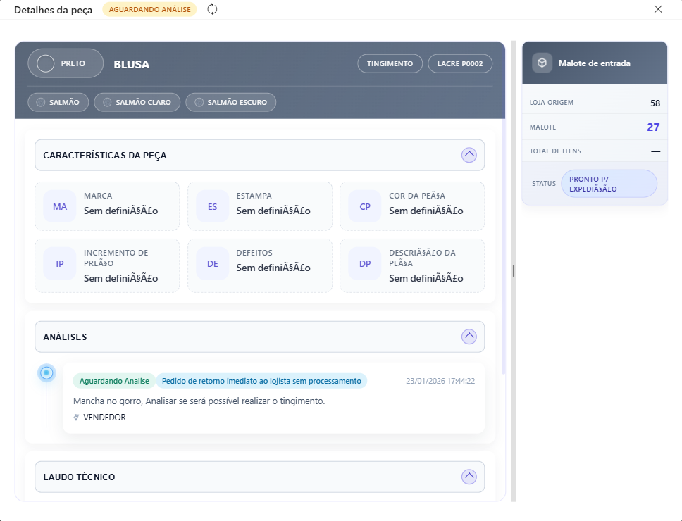 Após a bipagem, o sistema abrirá a tela de análise da peça para continuidade do processo.