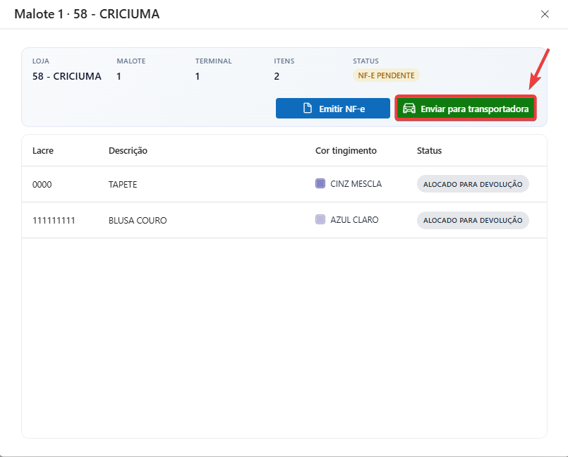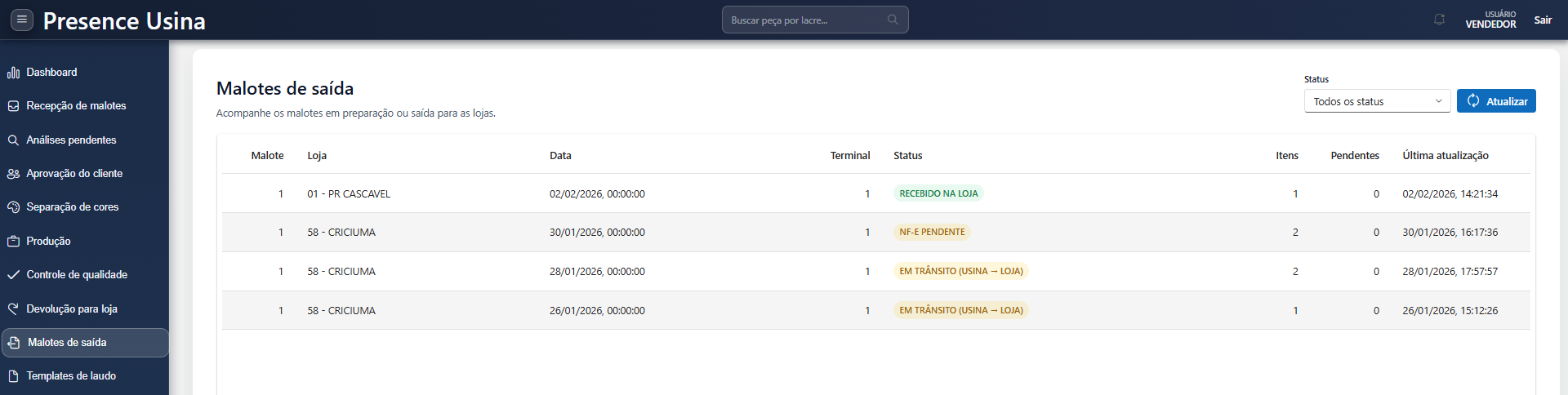 Após o envio, o malote permanecerá visível no módulo Malotes de saída, permitindo o acompanhamento até que o status seja alterado para Recebido na loja, encerrando o fluxo operacional.