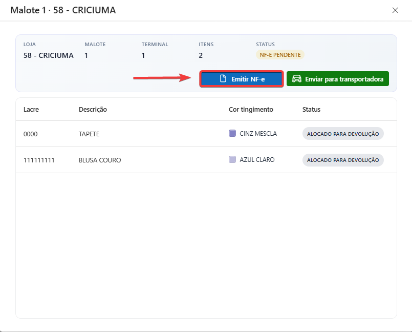 Quando o malote estiver com o status NF-e pendente, o usuário poderá: