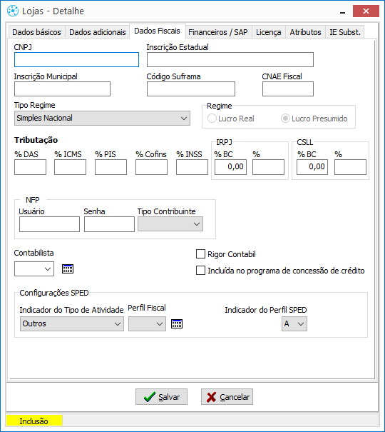Normal. Neste caso seleciona se é Lucro Presumido ou Lucro Real Tributações: Informar as alíquotas da loja para DAS (No caso de Simples),