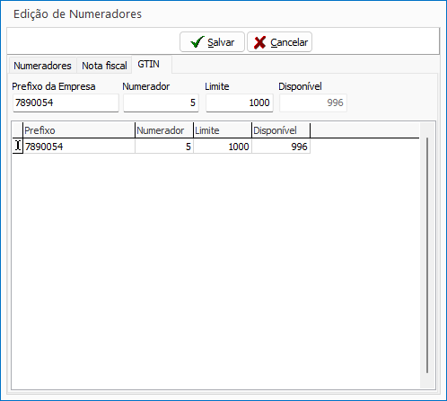 Preencha os campos Prefixo da Empresa, Numerador e Limite, conforme os dados informados pela GS1, e clique em Salvar.