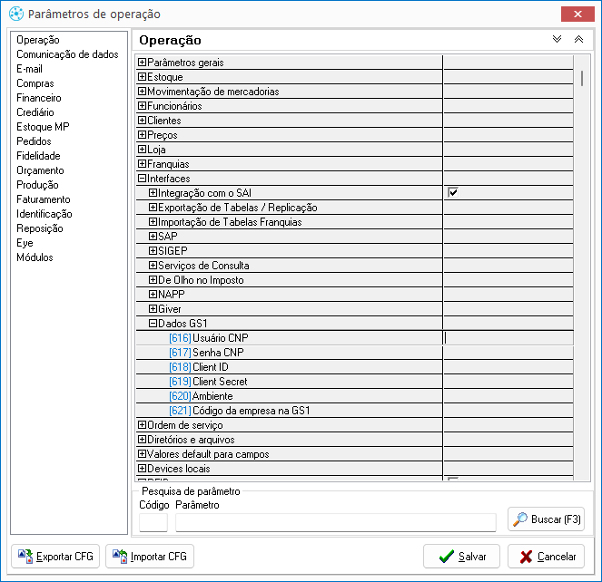 Em seguida, acesse: Presence Domain > Configurações > Parâmetros > Parâmetros de Retaguarda > Operação > Interfaces > Dados GS1