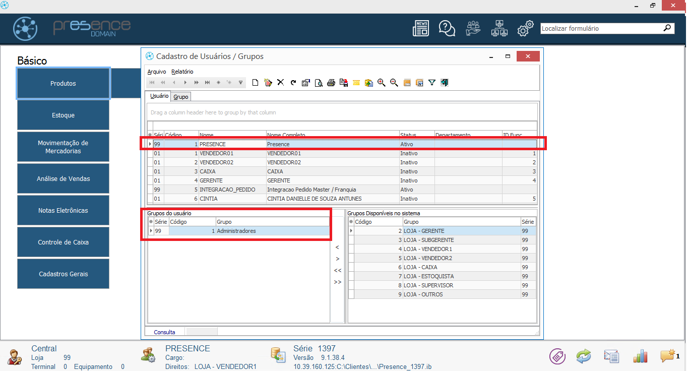Verifique na tela Usuários a qual Grupo de Usuários o usuário pertence.