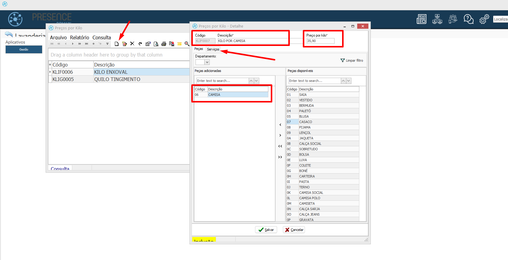 Os registros cadastrados nesta tela ficarão disponíveis para utilização na operação de pesagem durante o lançamento do ROL no Presence Laundry.