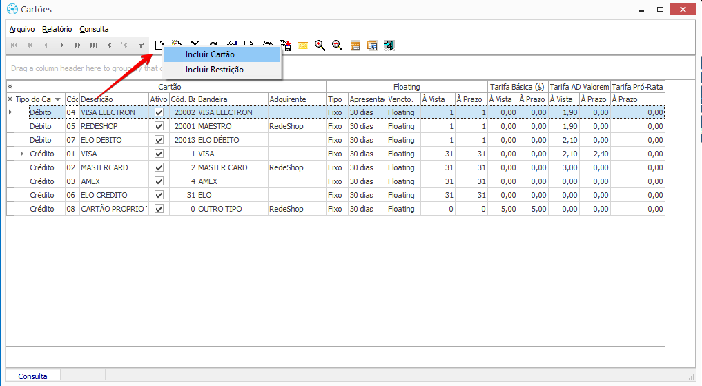 Para inclusão de Cartões por Loja, selecione o Cartão que deseja, clique em Incluir Restrição.