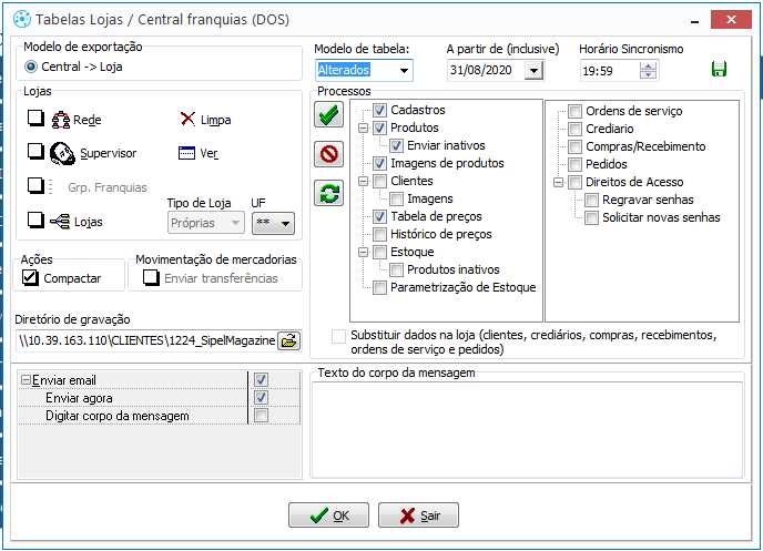 Desmarcar Enviar email, Enviar agora e Digitar corpo da mensagem