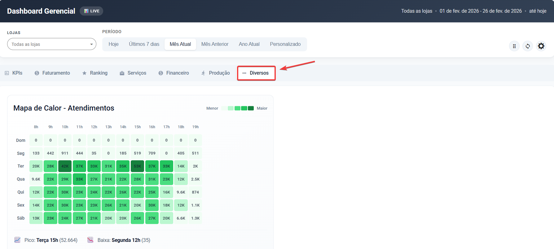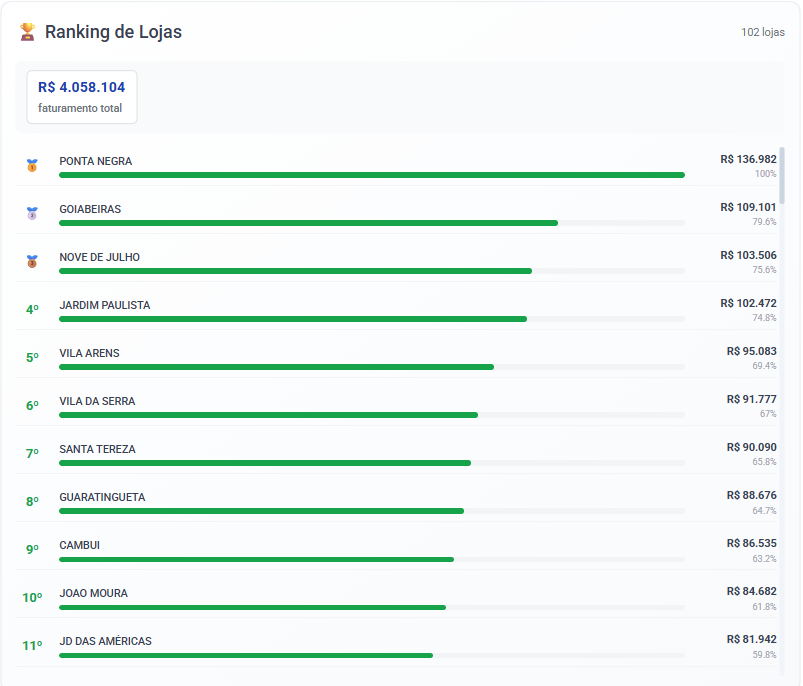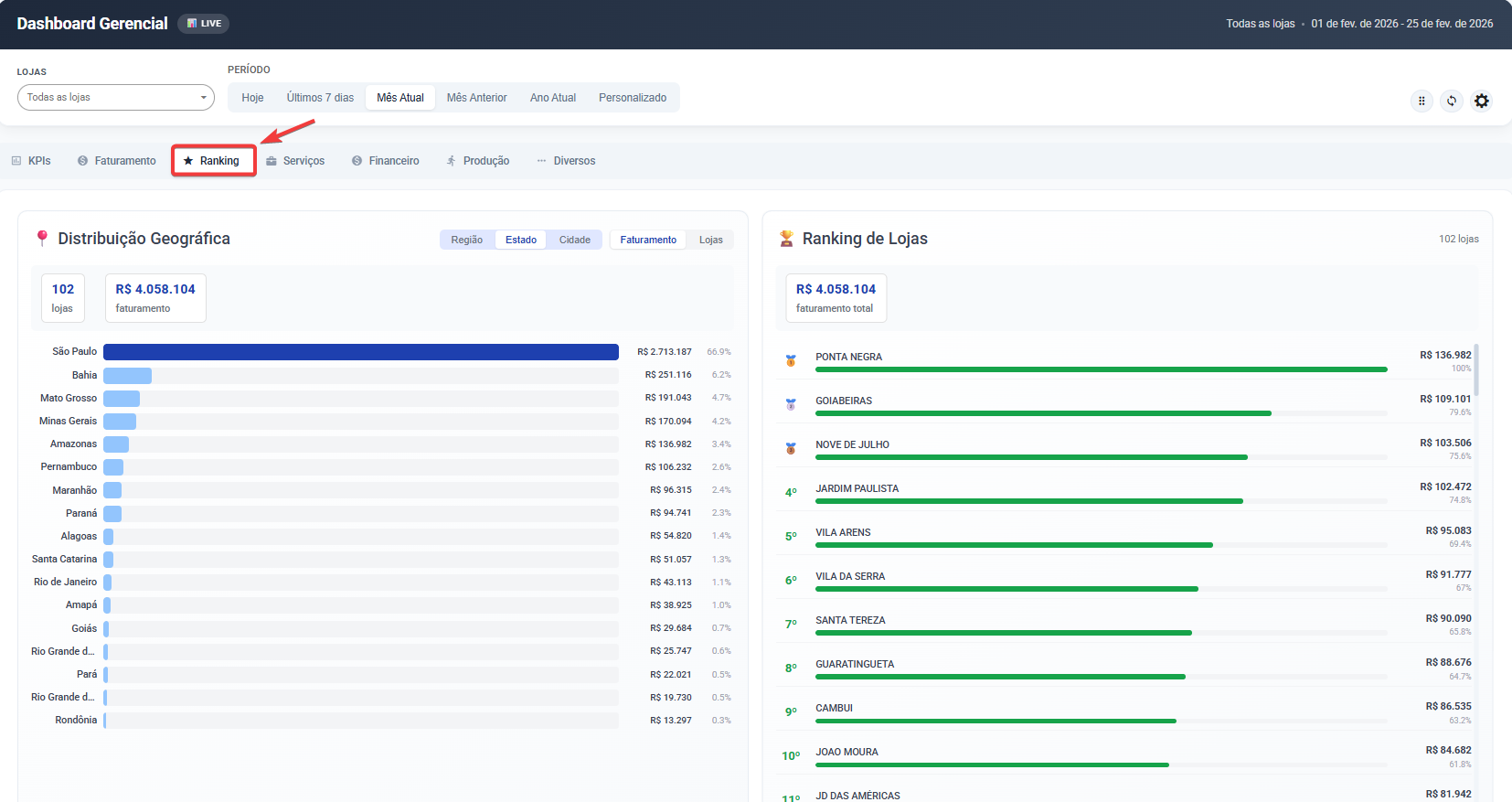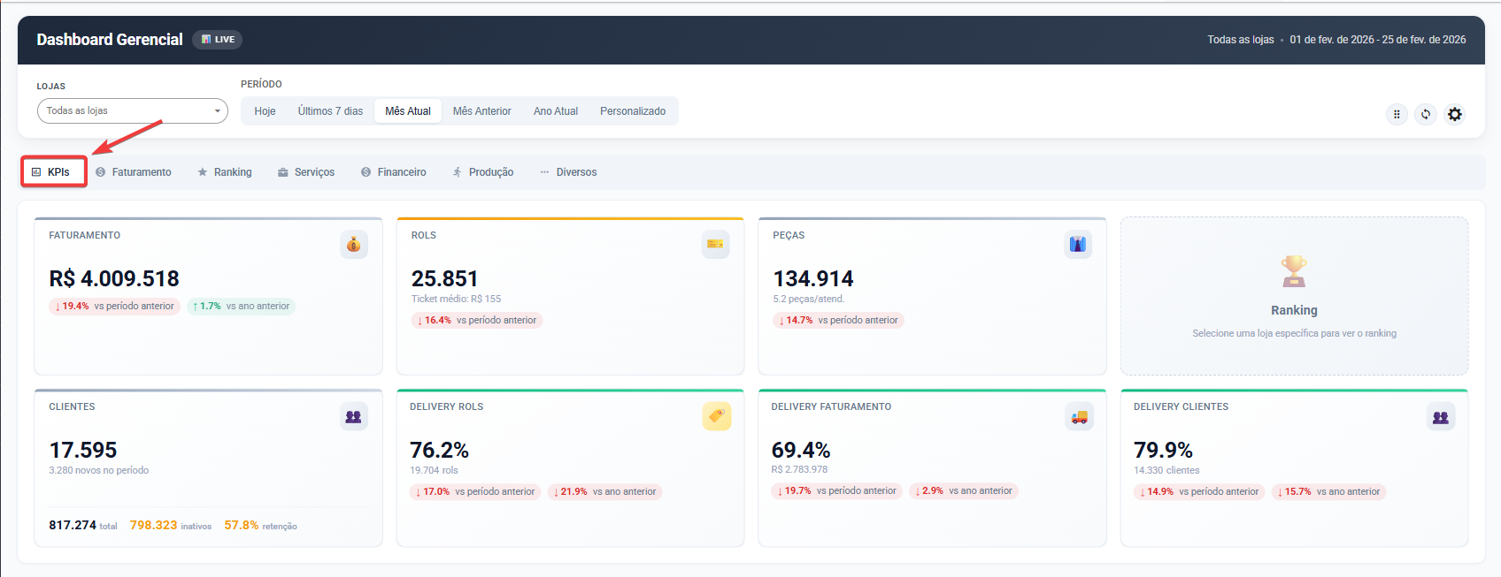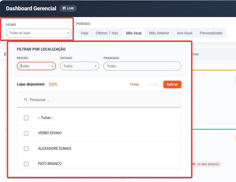Todos os dados respeitam os filtros de Loja e Período definidos no topo da tela.