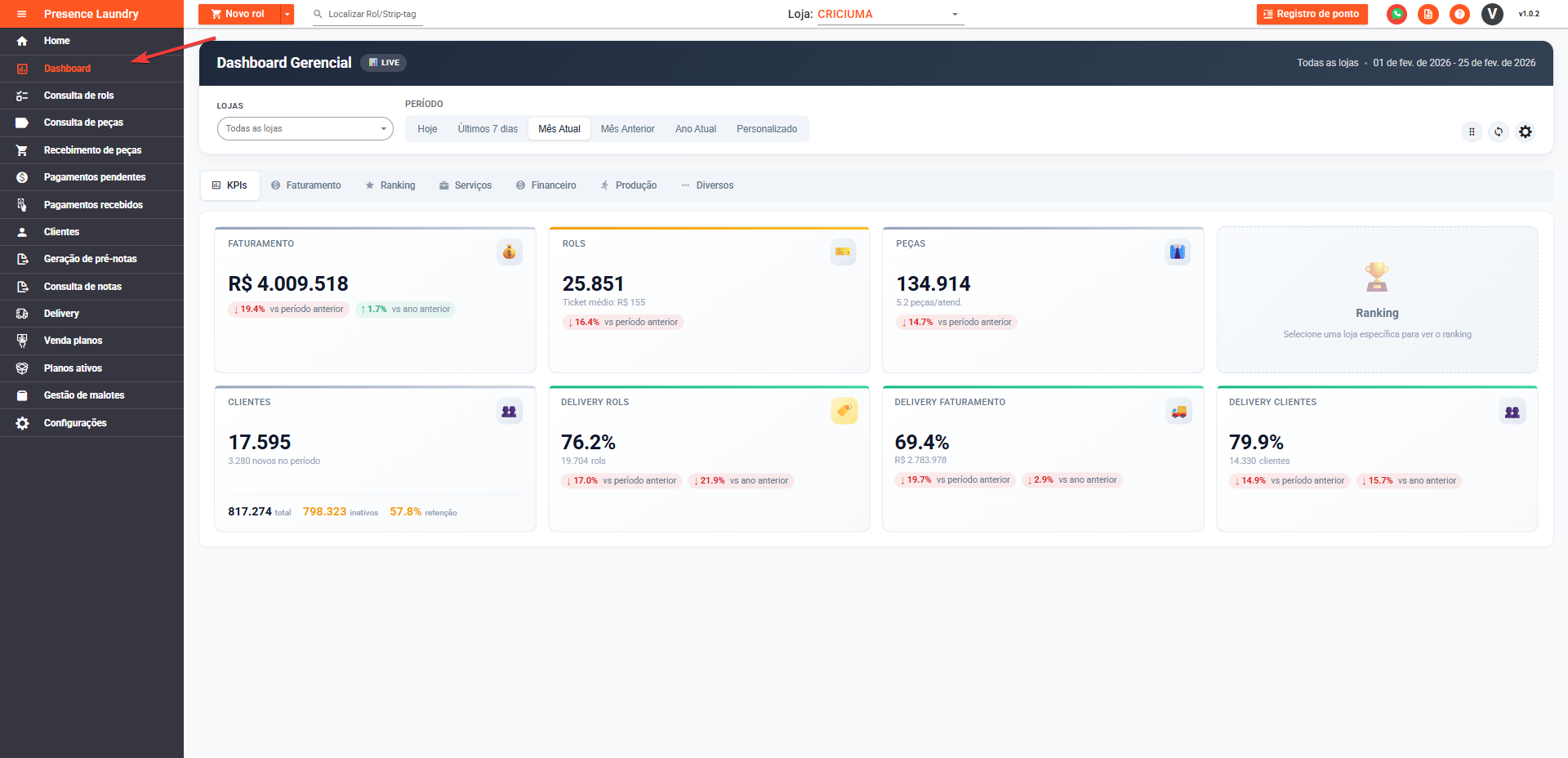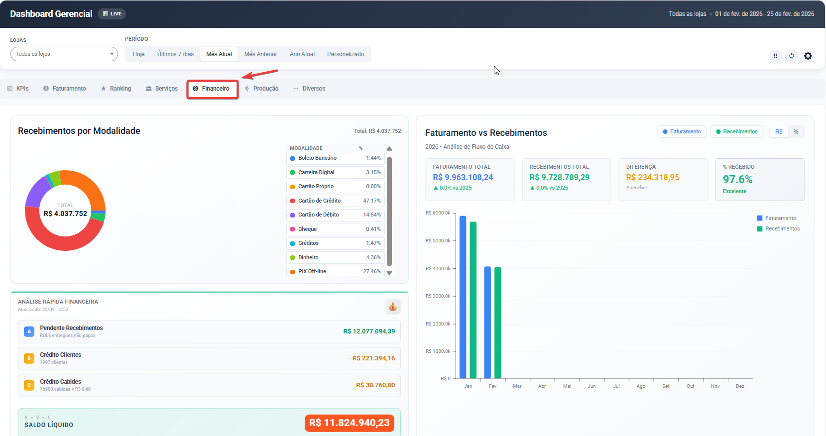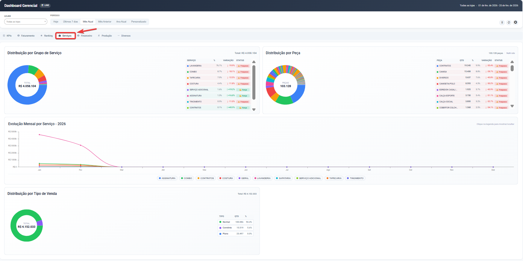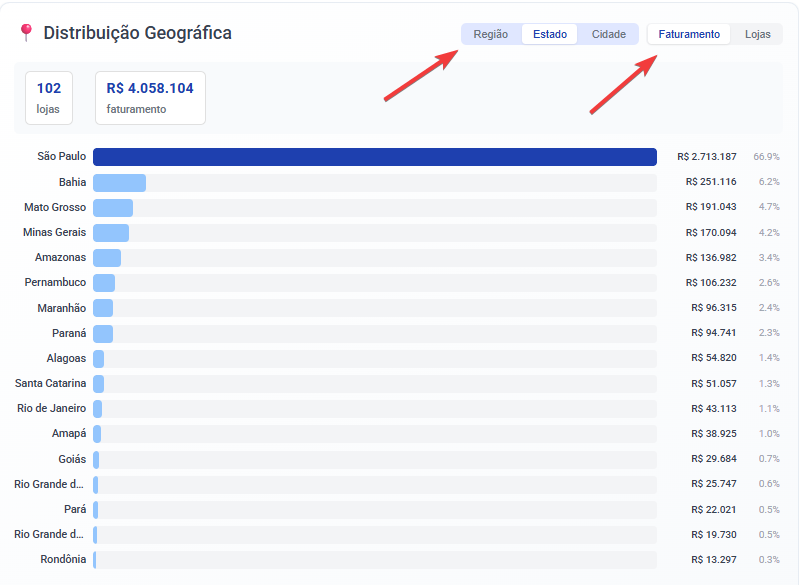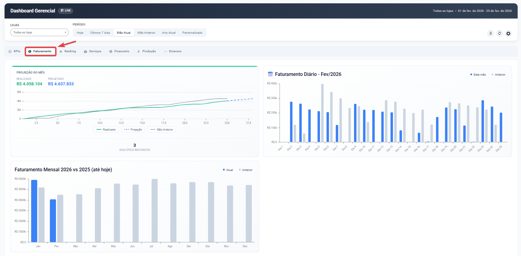 Todos os dados respeitam os filtros de Loja e Período definidos no topo da tela.