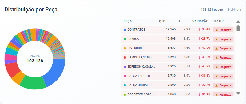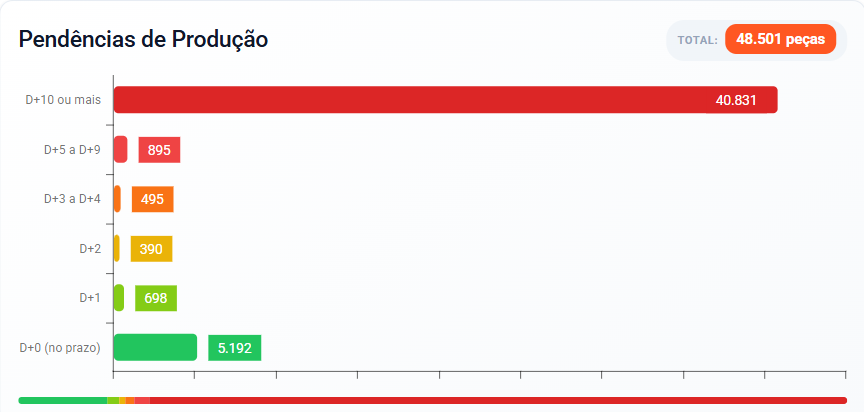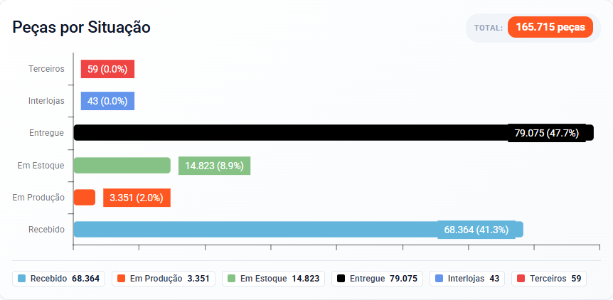 Gráfico horizontal que apresenta o volume total de peças distribuídas por status operacional.