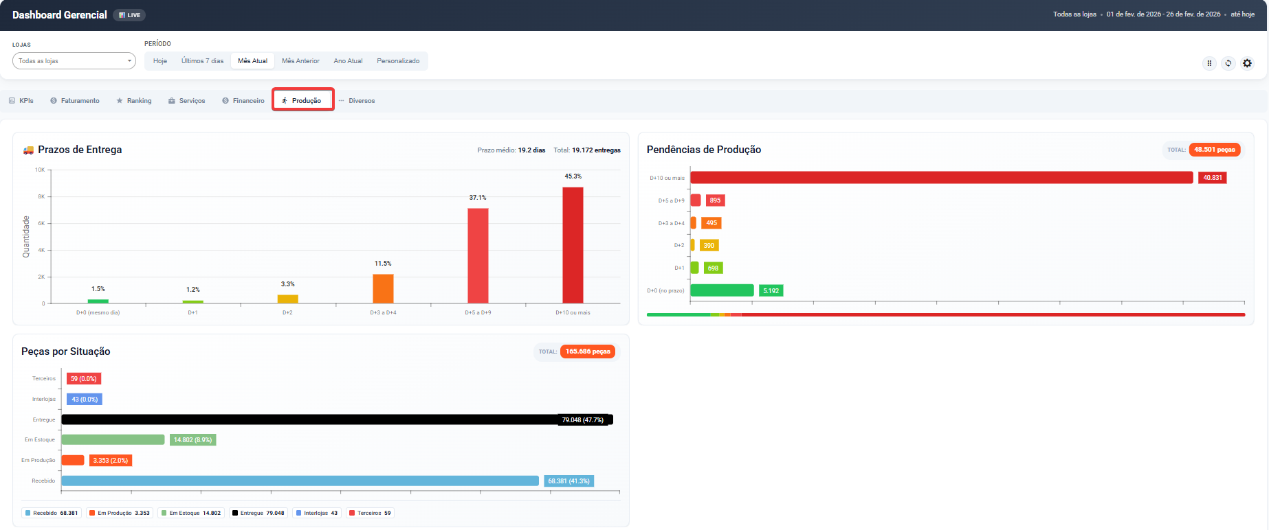 A aba Produção apresenta indicadores relacionados aos prazos de entrega, volume de peças em processamento e situação produtiva da operação.