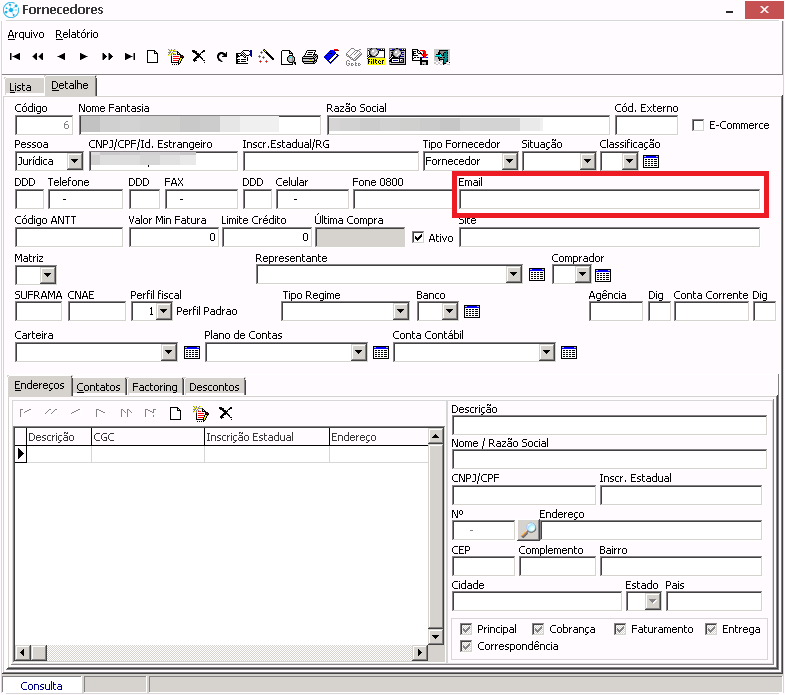 Verifique se o campo E-mail está preenchido. Caso esteja em branco, informe o e-mail do fornecedor e salve o cadastro.