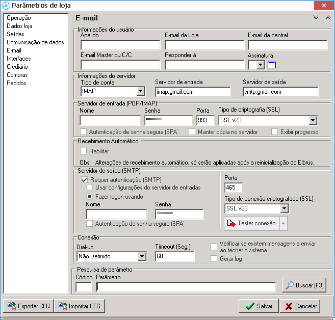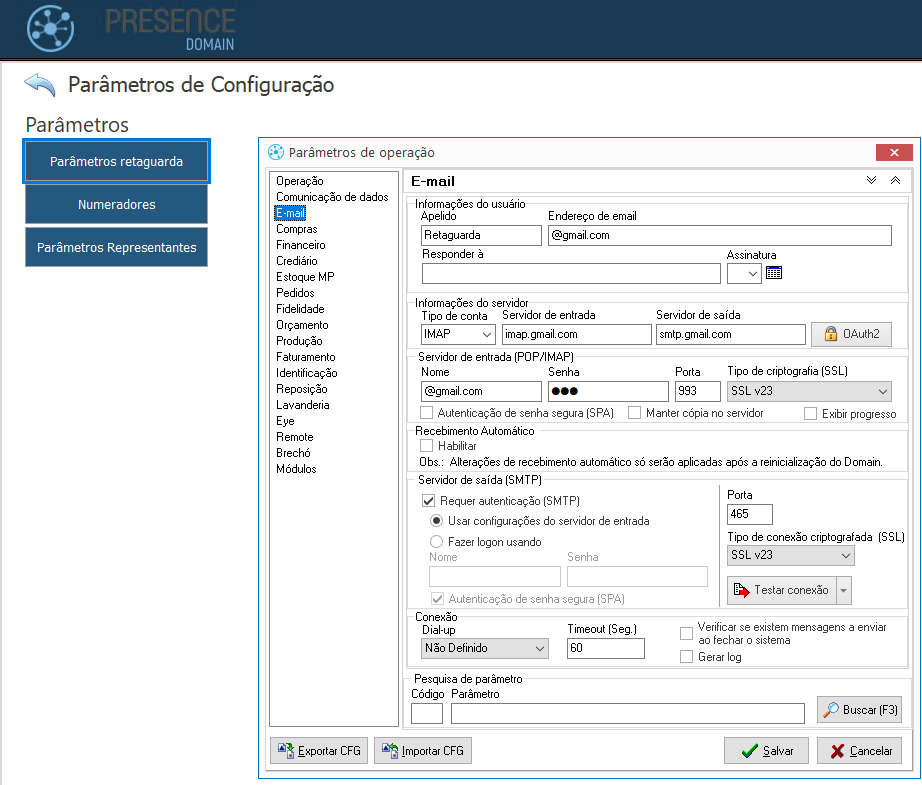 Os parâmetros de e-mail definem como o sistema realizará o envio e recebimento das mensagens.