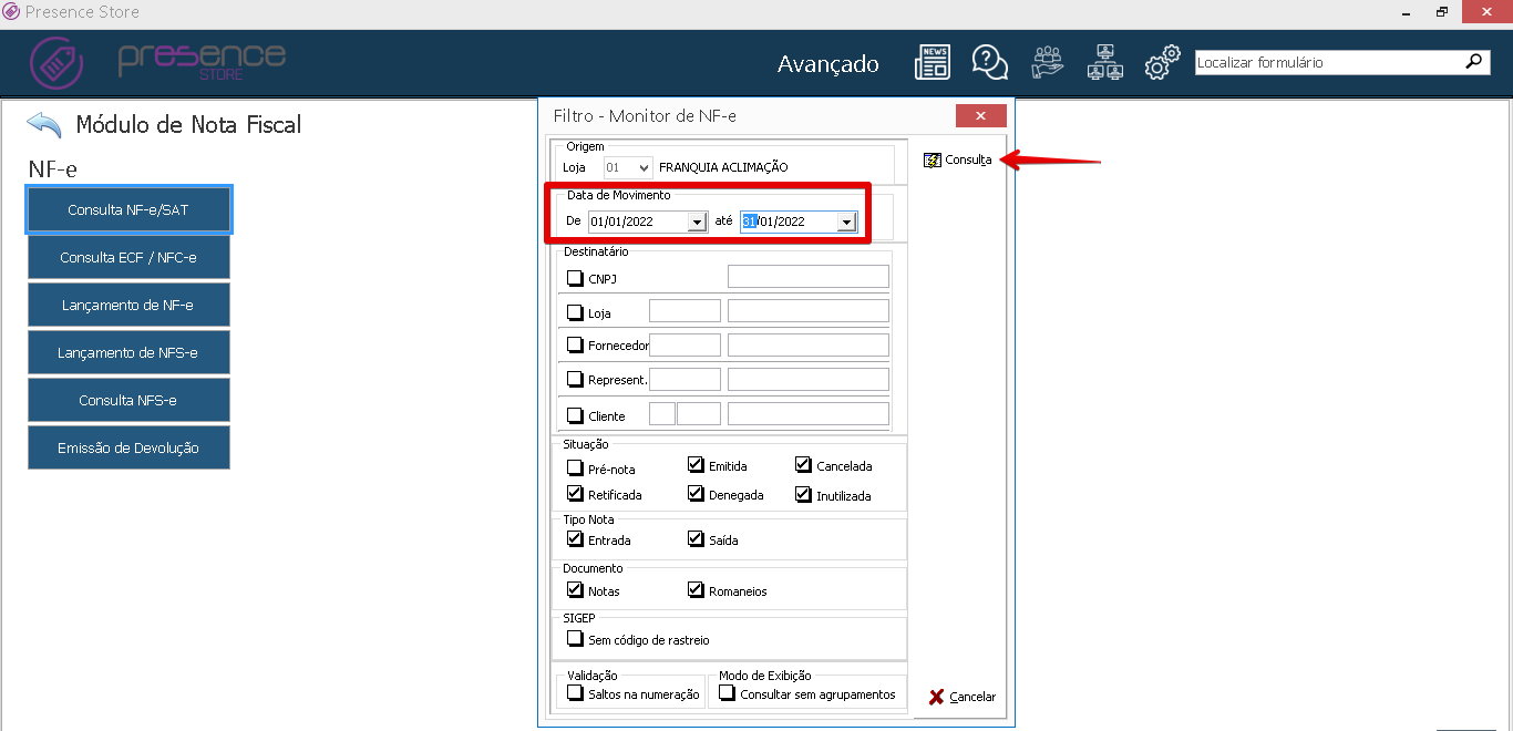 Loja > Nota Fiscal > NF-e > Consulta NF-e
