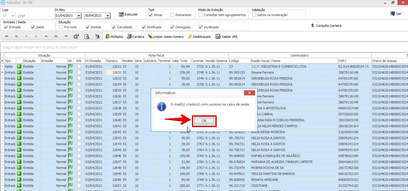 Ao final, o sistema exibirá a mensagem informando que o e-mail foi enviado com sucesso para a caixa de saída.