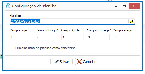 A importação é realizada através da tela Configuração de Planilha, onde são definidos quais campos da planilha correspondem às informações que serão preenchidas na Ordem de Compra.