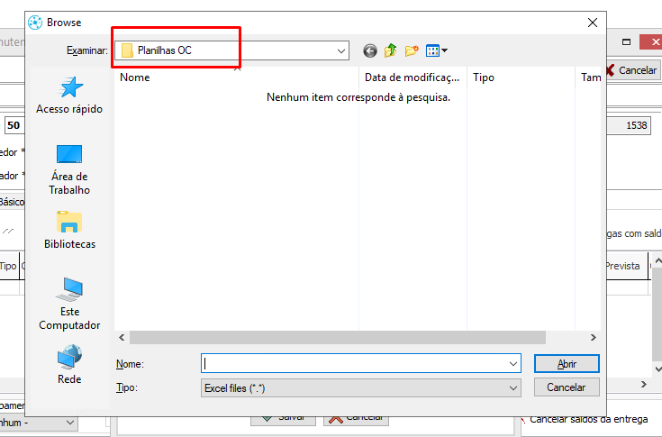 Caso a planilha esteja armazenada em uma pasta de rede, é possível acessar o arquivo informando o caminho diretamente na janela de seleção.