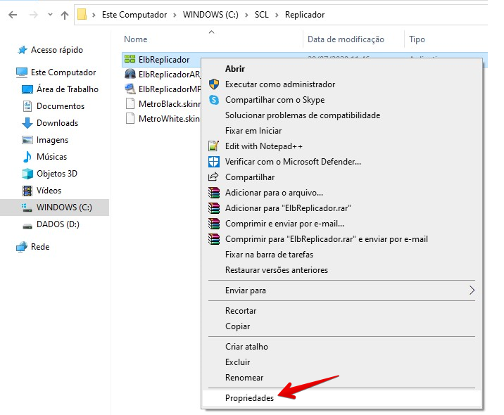 3. Nas Propriedades do arquivo ElbReplicador selecione