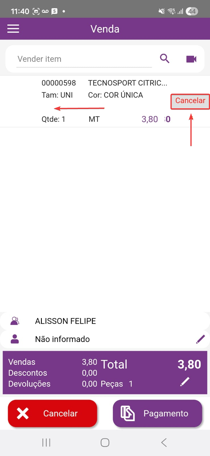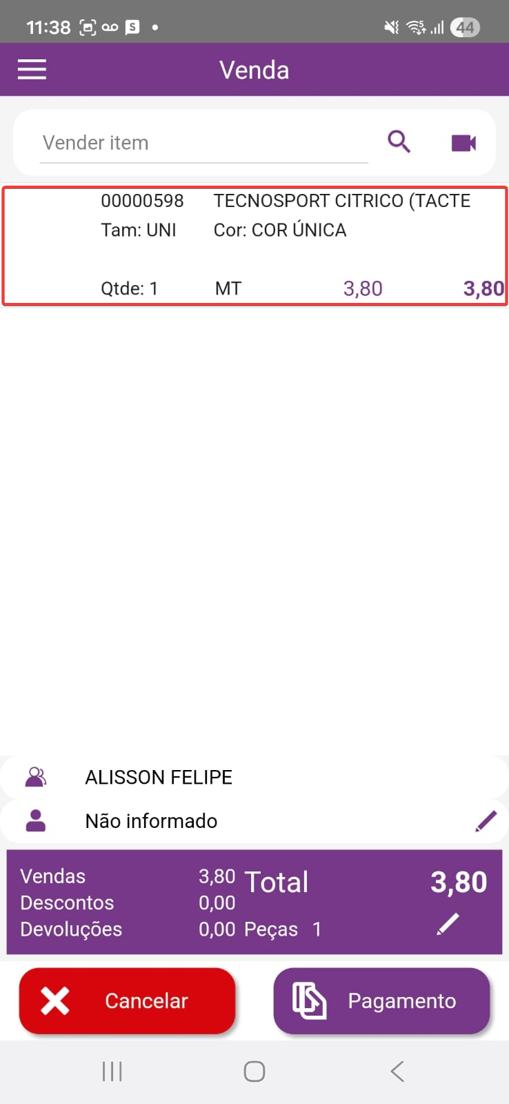 Após incluir o produto na venda, o usuário pode realizar ajustes no item selecionado.