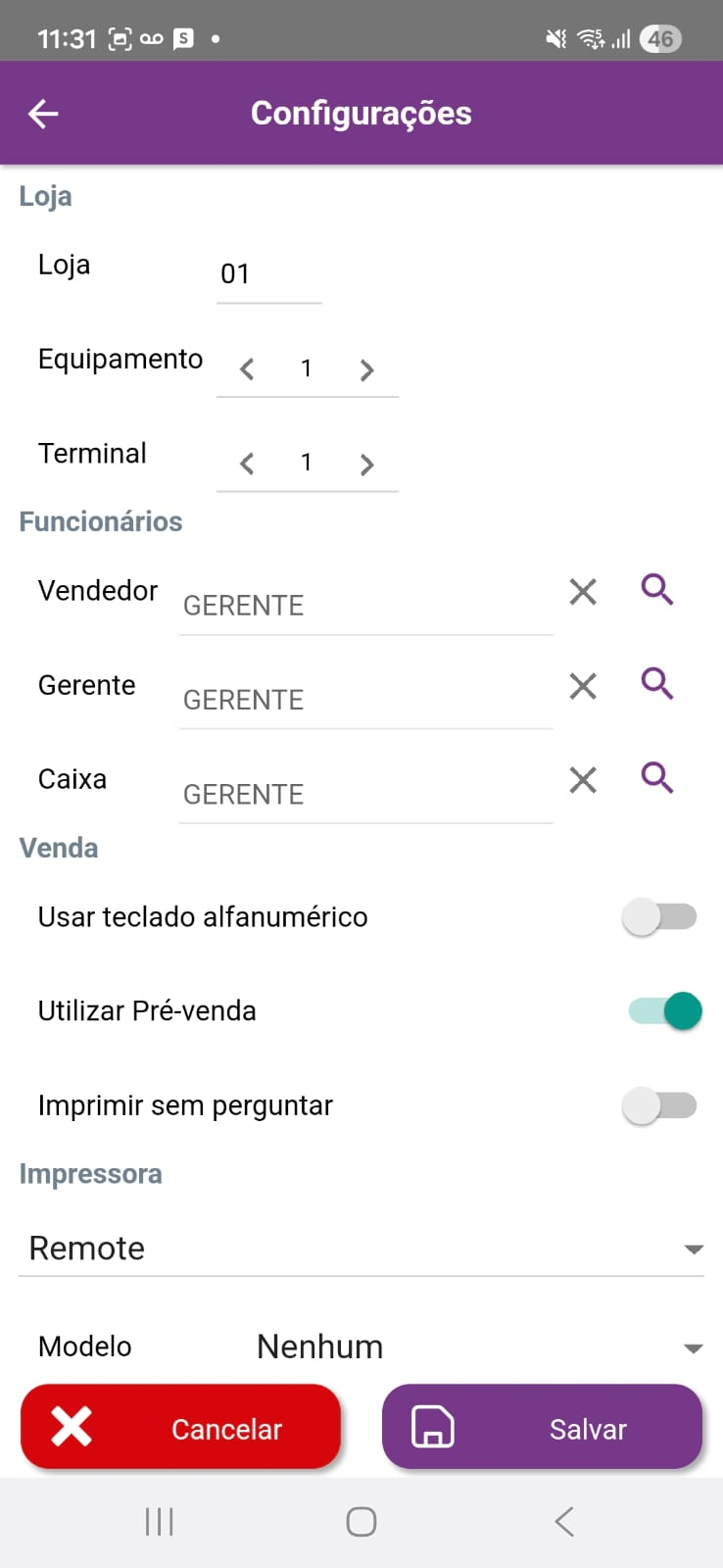 Permite configurar loja, terminal, equipamento e funcionários utilizados nas vendas.