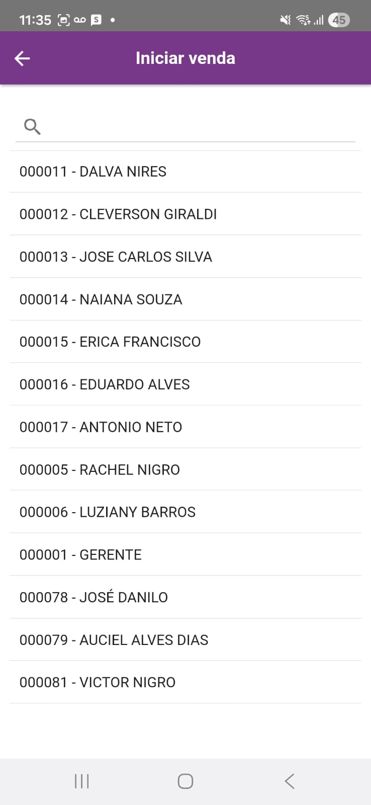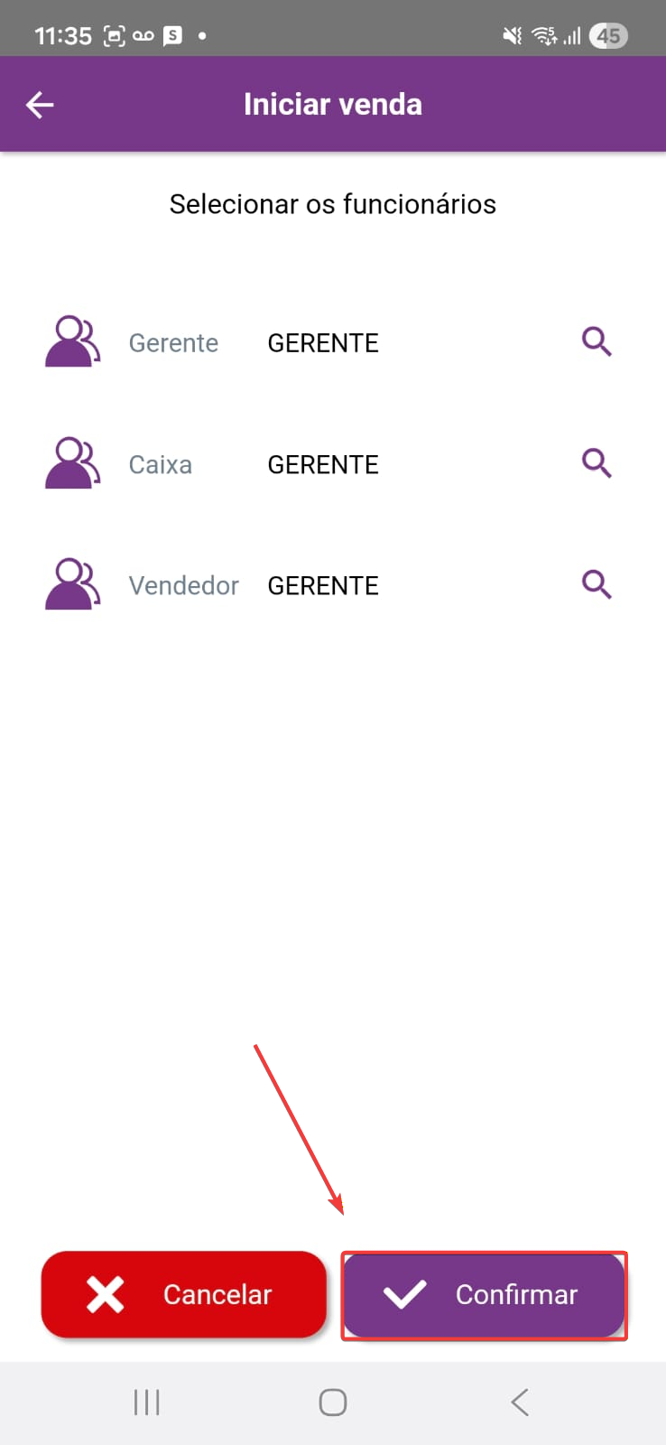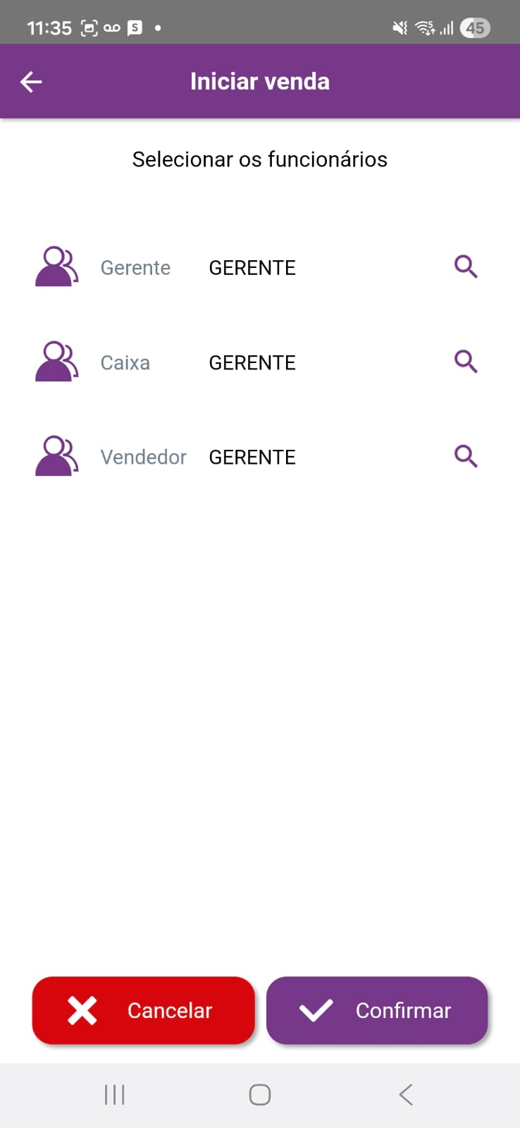 Ao iniciar o processo de venda, o sistema exibirá uma tela para seleção dos funcionários responsáveis pela operação.
