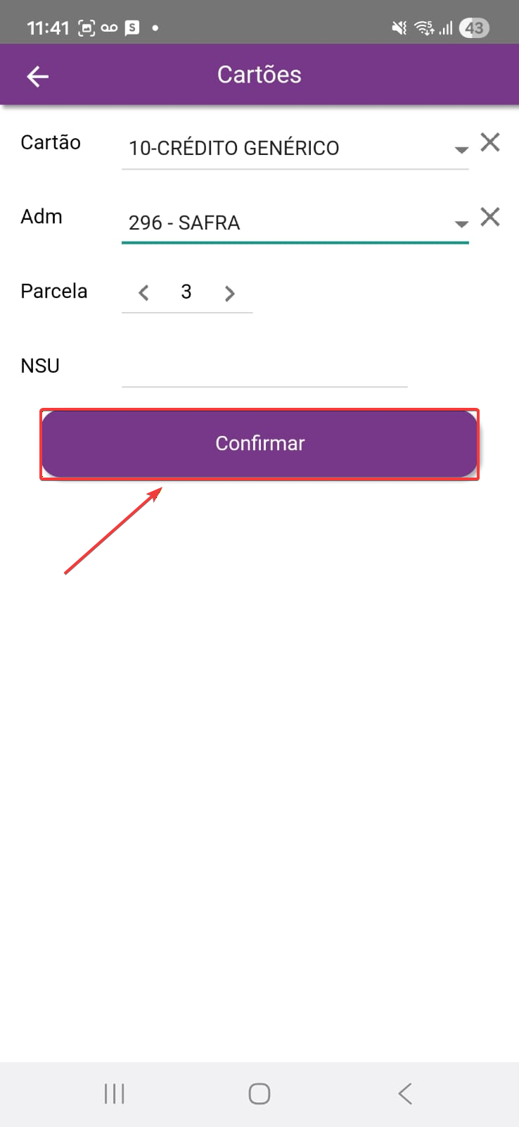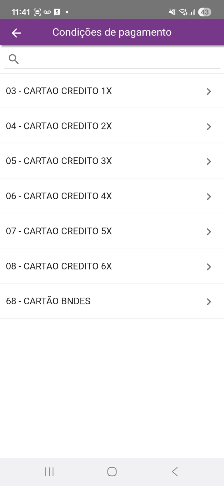 Em caso de pagamento via cartão, o sistema exibirá a tela de condições de pagamento, onde deverão ser informados: