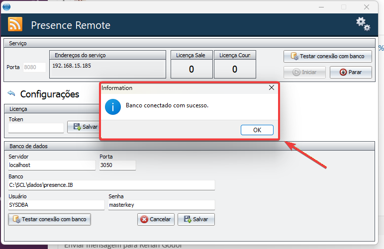 Caso a configuração tenha sido realizada corretamente, o sistema exibirá uma mensagem confirmando que a conexão com o banco foi estabelecida com sucesso.