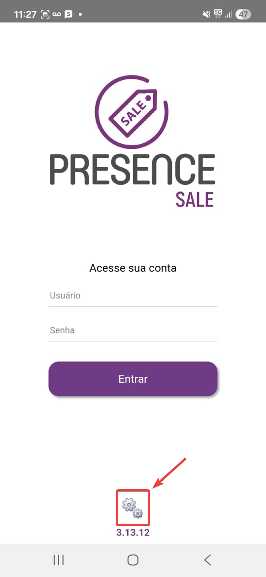 No aplicativo Presence Sale, na tela inicial, toque no ícone de engrenagem localizado abaixo do botão Entrar.