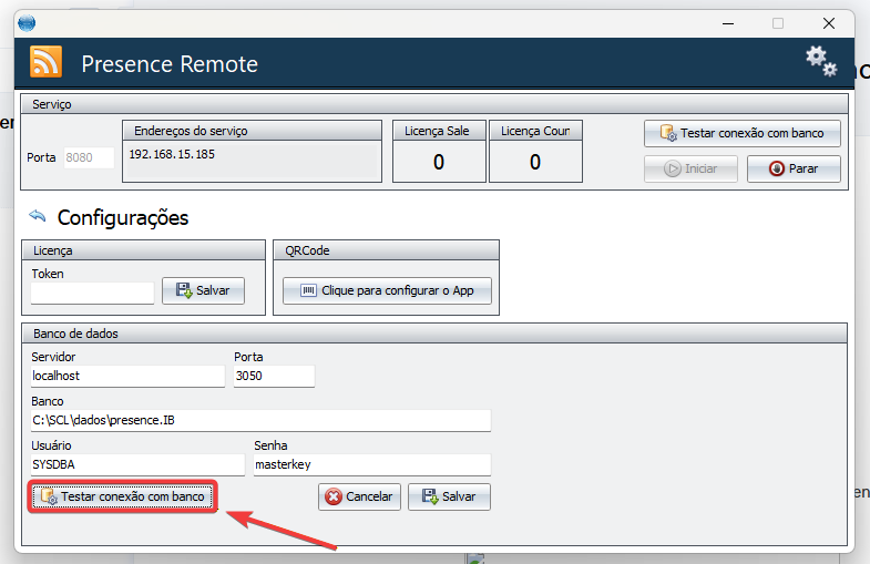 Para configurar a conexão com o banco de dados, abra o executável PresenceRemote.exe, localizado dentro da pasta Loja.