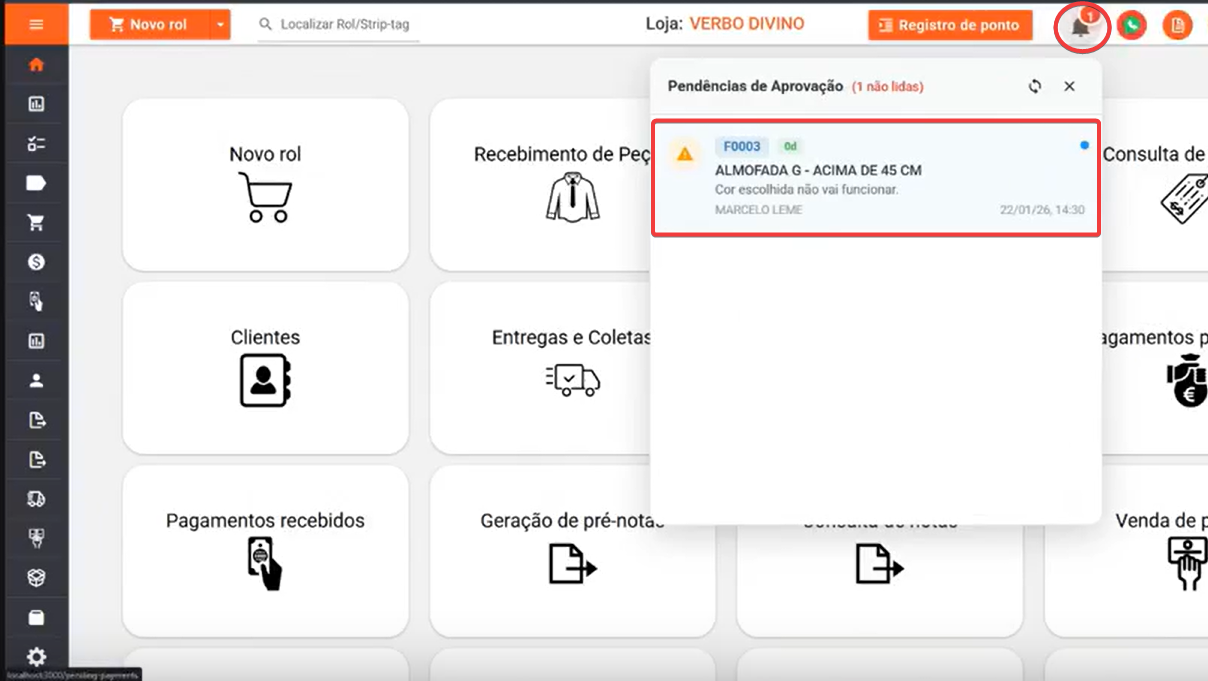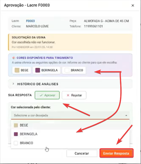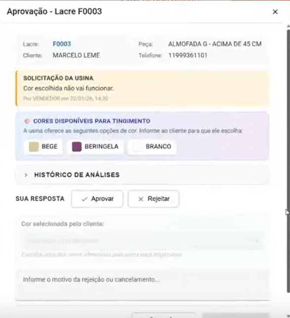 O fluxo de pedido de aprovação garante que o cliente tenha ciência e controle sobre o serviço de tingimento antes da execução, assegurando alinhamento entre loja e usina e reduzindo retrabalhos no processo.