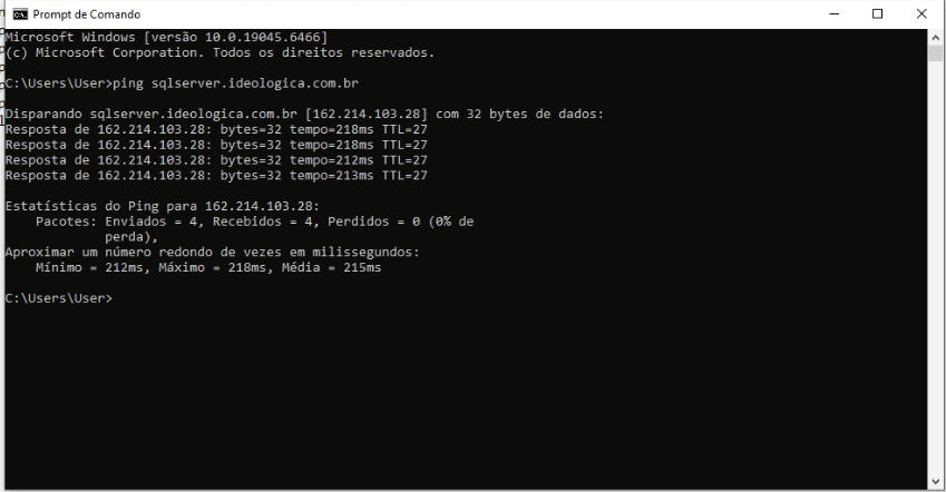 Usar o caminho coletado no CMD para coletar o IP, usar comando abaixo.Após executar o comando ping, será exibido o retorno com as informações de comunicação com o servidor SQL.A seção “Estatísticas do Ping com o IP” indica o endereço IP que deverá ser utilizado na configuração do Presence Integrador.
