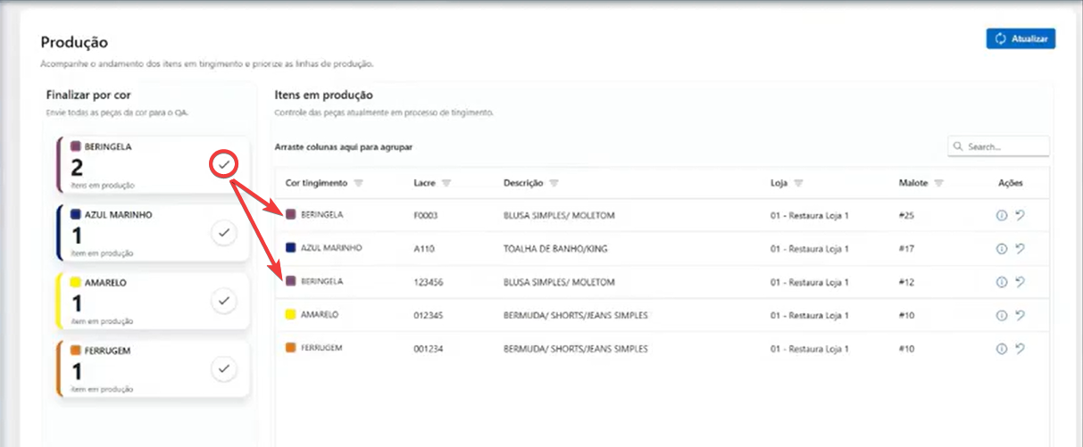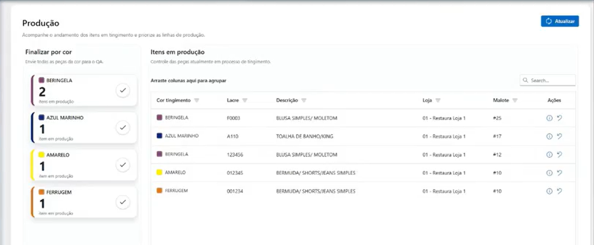 Nesta tela, o usuário pode acompanhar o andamento da produção e finalizar o processo assim que o tingimento for concluído.