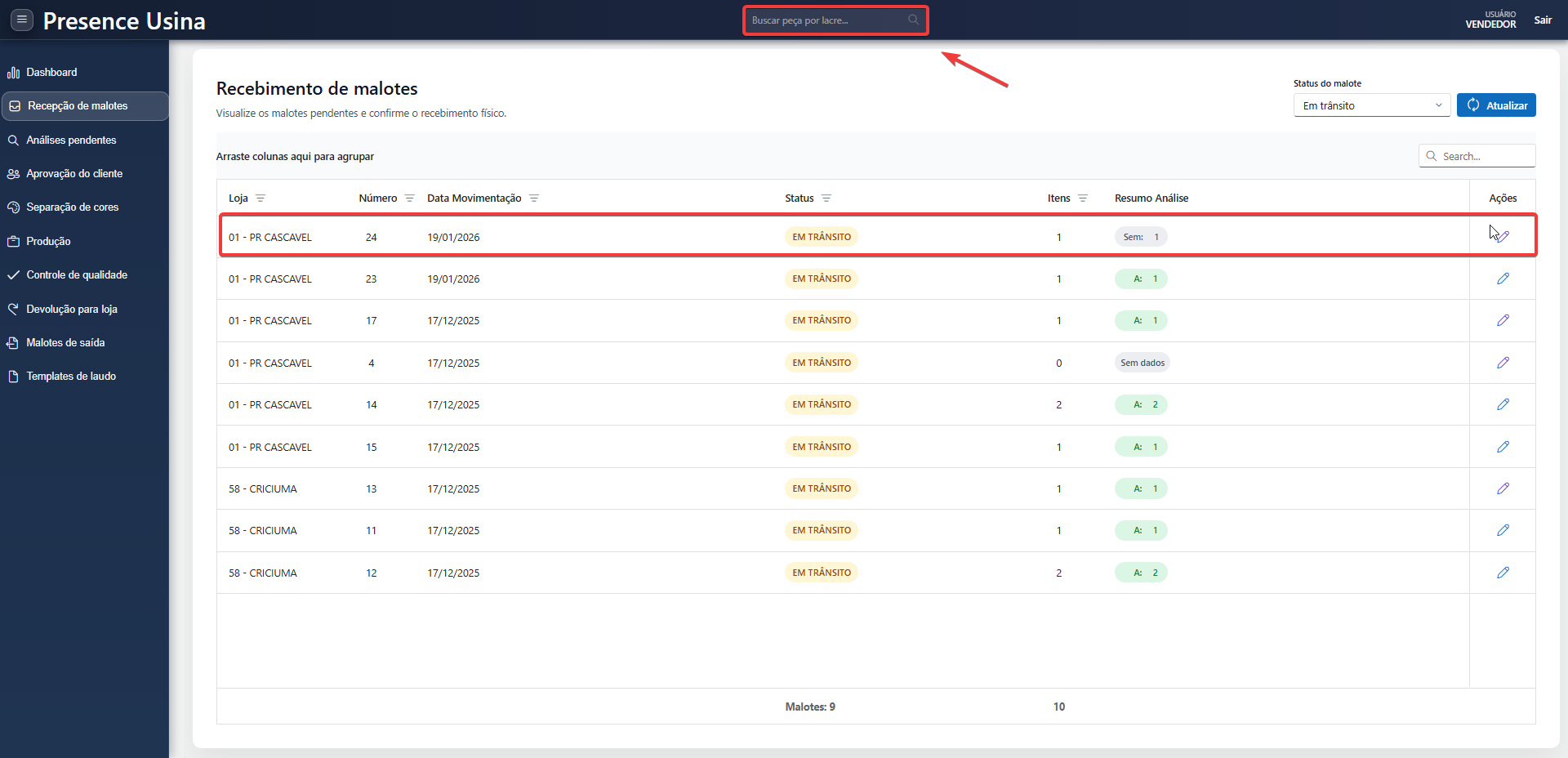 Utilizando a busca por lacre na parte superior da tela