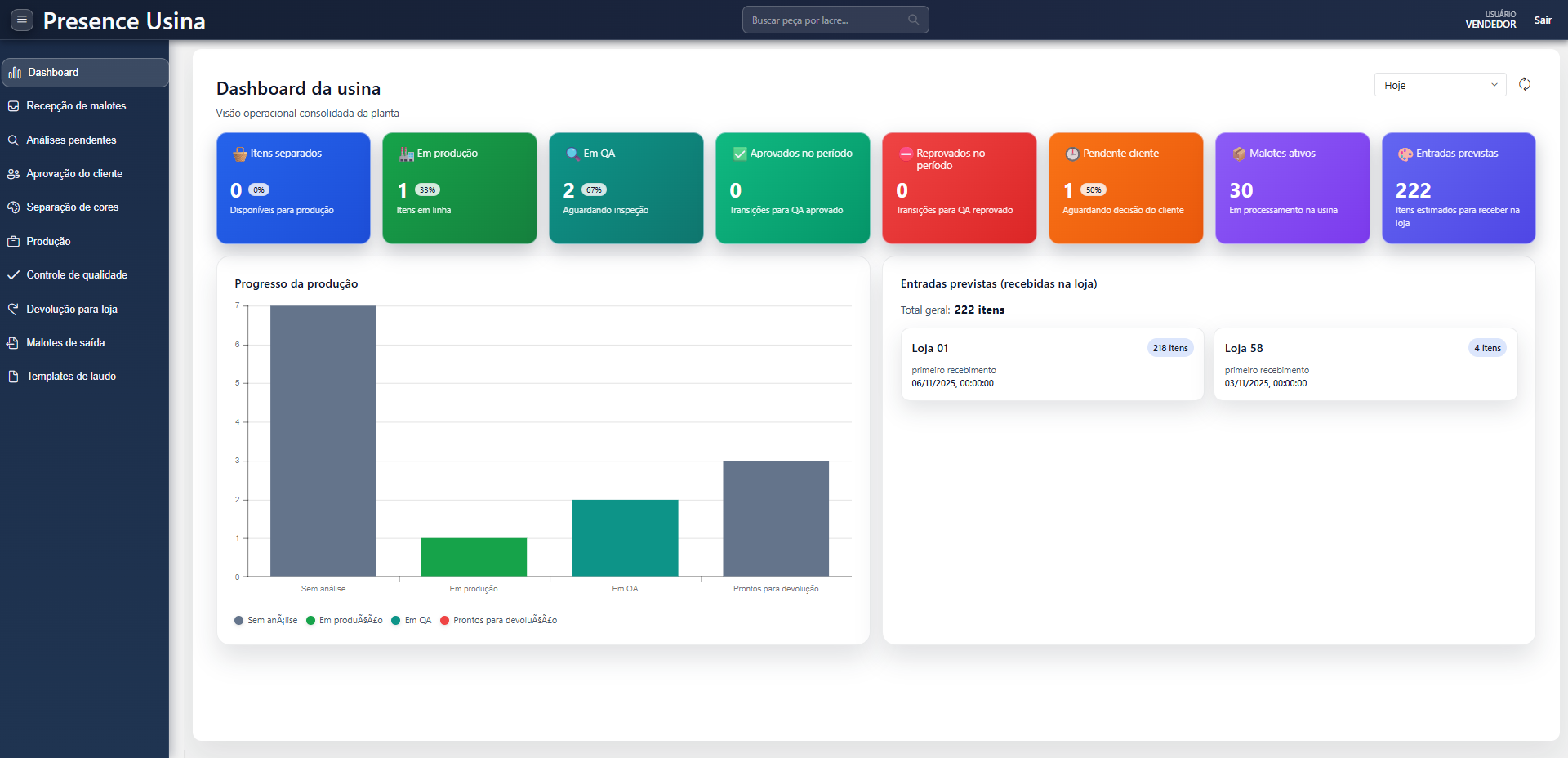 Na tela inicial do sistema (Dashboard), é possível visualizar as entradas previstas, mesmo antes da lavanderia gerar efetivamente o malote.